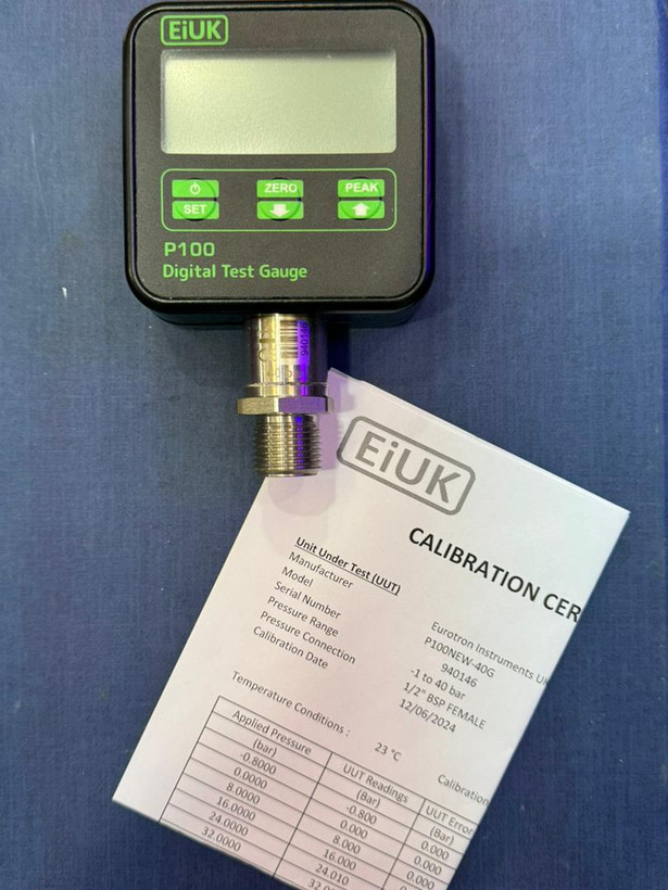 تست گیج خلاء و فشار 1- تا 40 بار یوروترون EUROTRON EiUK P100 محصول Eurotron ساخت شرکت Eurotron (EiUK) انگلیس است. این گیج دیجیتال فشار برای اندازهگیری، تست و کالیبراسیون گیجها، ترنسمیترها و سوئیچهای فشار طراحی شده و بهعنوان مرجع دقیق فشار در کارگاه یا محیط کالیبراسیون مورد استفاده قرار میگیرد.