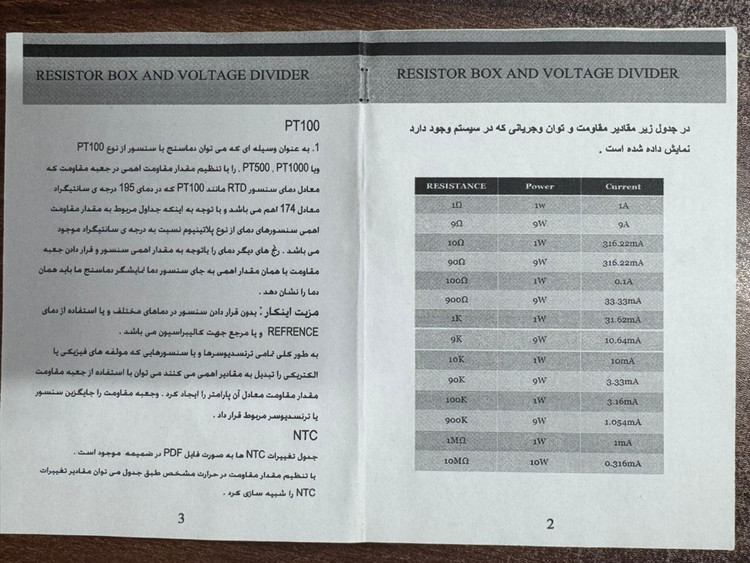 برای شبیهسازی سنسورهای دما از نوع NTC نیز میتوان از این جعبه مقاومت استفاده کرد. کافی است جدول مربوط به سنسور NTC موردنظر را مطالعه کرده و مقاومت متناظر هر دما را روی دستگاه تنظیم نمود.