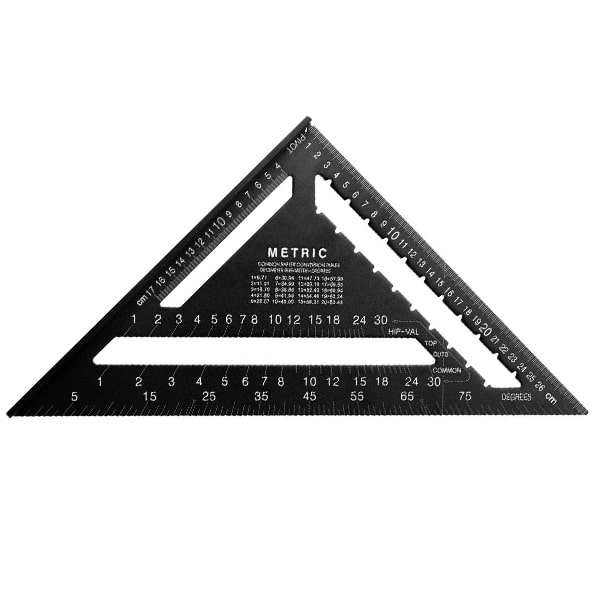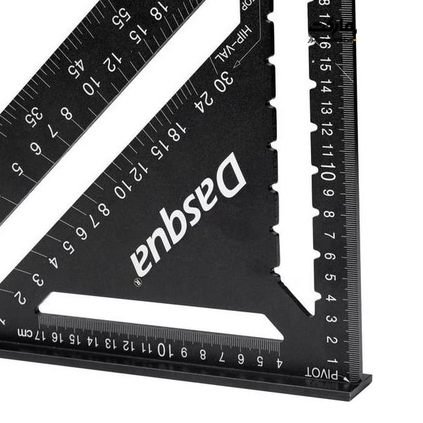 مشخصات محصول گونیا حرفه ای سه گوش داسکوا 300x170 میلی متر مدل 0706-1804 ابزارهای تخصصی نجاری و برشکاری داسکوا تحت لیسانس کشور ایتالیا گونیا سه گوش معروف به نوع Rafter Square یا Speed Square ایده آل برای محاسبه زاویه تیرهای نگهدارنده طاق، بام و سقف شیب دار دارای 2 لبه مدرج برای تیرهای چوبی سقف عمومی، سقف Hip و Valley مناسب برای معماری و طراحی کلبه، قایق، کشتی، وسایل و اماکن چوبی مجهز به یک ضلع لبه دار 300 میلی متری و نقطه صفر شاخص Pivot سری حرفه ای Pro با دو شیار جهت خط کشی منظم و برشکاری موازی یکپارچه با لبه ضخیم جهت برش راحت تر چوب های کفپوش، پارکت و... بدنه از جنس آلومینیوم آنودایز شده مشکی توسط ماشین های CNC حکاکی لیزری بدون پاک شدن اعداد و ارائه با ضمانت اصالت کالا