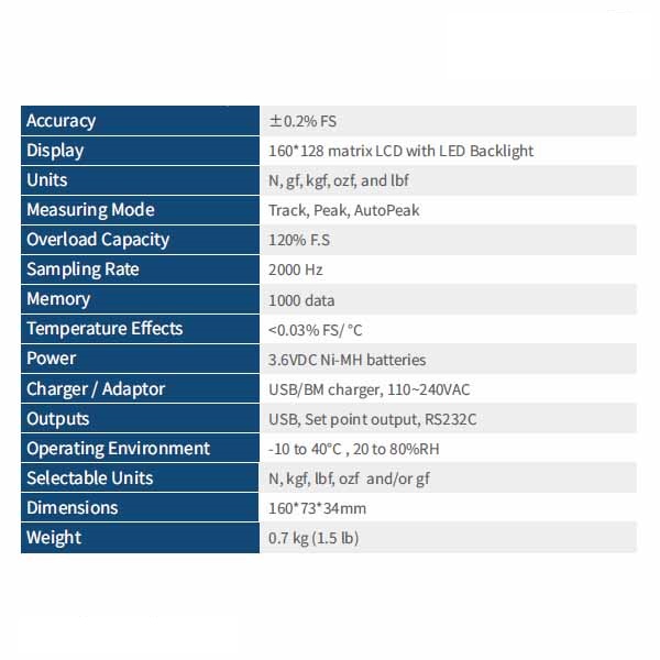 مشخصات محصول نیروسنج دیجیتال لمسی داسکوا مدل 1115-1804 گیج نیرو سنج دیجیتال تحت لیسانس کشور ایتالیا از کمپانی Dasqua مجهز به صفحه کلید لمسی برای افزایش سرعت و راندمان و کاهش خطا امکان خروجی گرفتن از محاسبات و انتقال به کامپیوتر با کمک پورت USB رزولوشن صفحه 0.1 نیوتن و ظرفیت اندازه گیری تا حداکثر 1000 نیوتن صفحه نمایش ماتریکسی LCD با عملکرد اتوماتیک و نور پس زمینه LED امکان کار با واحد نیوتن، گرم و کیلوگرم-فورس، پوند-فورس و اونس-فورس بدنه فلزی فشار قوی ارگونومیک و دارای حافظه ذخیره 1000 عدد محاسبه تغذیه با باتری شارژی داخلی 3.6 ولت Ni-Mh و قابل شارژ با کابل USB 3 مود نمایش لحظه ای، پیک و Preset و قابل کار در دمای 10- تا 40 درجه طبق استاندارد اروپا و ارسال فوری با ضمانت اصالت و کالیبراسیون کالا