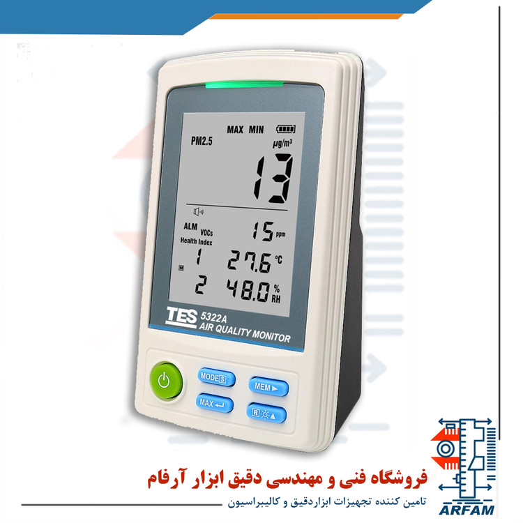 VOC متر و ذره سنج PM2.5 مدل TES-5322 ، ابزاری ساده برای اندازه گیری گرد و غبار هوا (داخل ساختمان) می باشد. دستگاه قادر به خوانش مستقیم درجه آلودگی هوا می باشد.