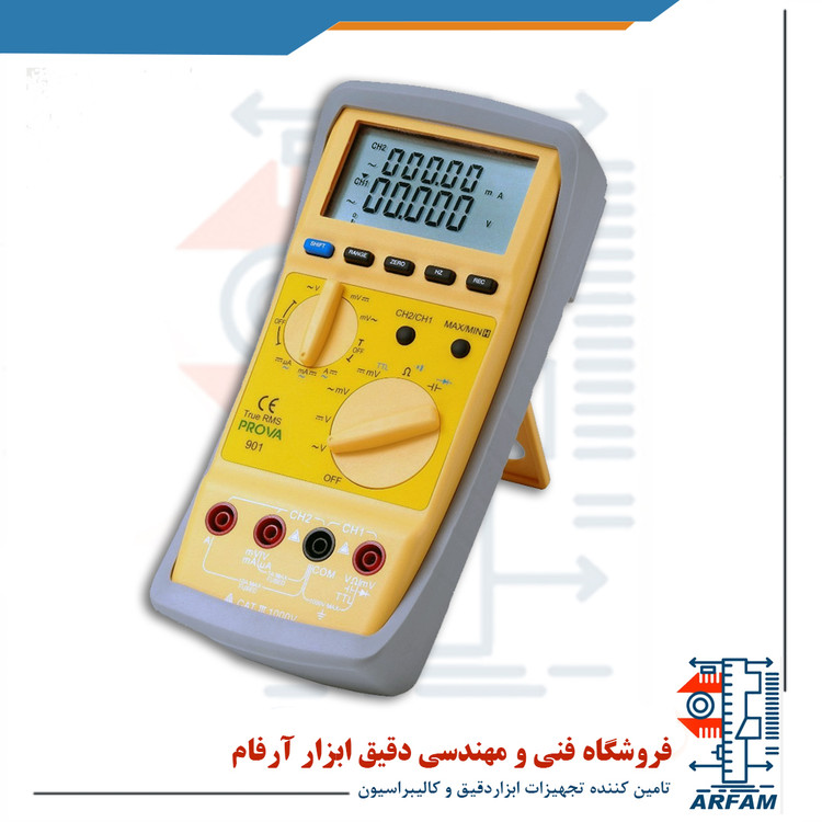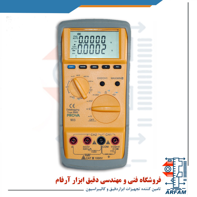 مولتی متر دقیق Prova-903 دو مولتی متر در یک دستگاه می باشد. بطوریکه میتوان به صورت"همزمان" ولتاژ و جریان را با هم و یا دو ولتاژ و دو جریان مختلف را مشاهده نمود. مولتی متر Prova 903 دستگاهی برای اندازه گیری کمیت های ولتاژ، جریان، مقاومت و خازن می باشد. این مولتی متر دو کاناله از نوع مولتی متر دستی و دیجیتال میباشد. از ویژگی های مهم مولتیمتر پرتابل Prova 903 رنج اتوماتیک ، اندازه گیری True RMS پارامترهای AC، تست دیود و تست اتصال کوتاه، ماکزیمم ولتاژ 1000V و جریان 10A است.