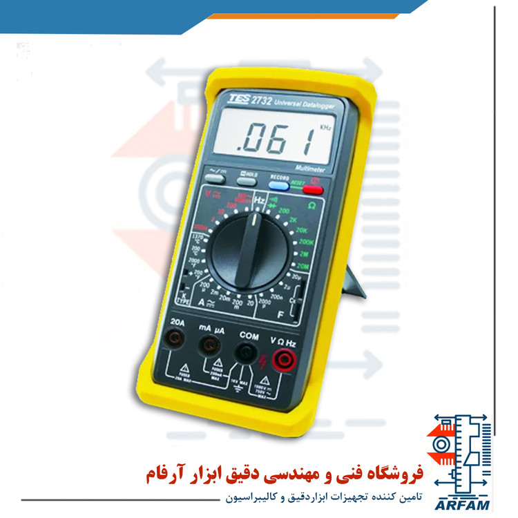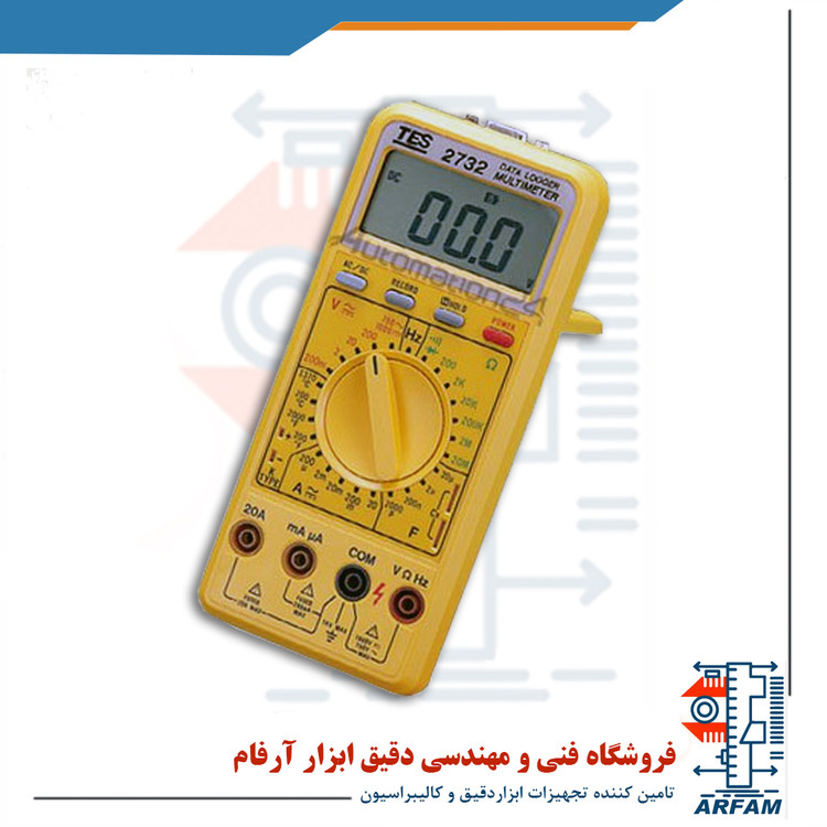 مولتی متر tes-2732 علاوه بر داشتن ویژگی های یک مولتیمتر دیجیتالی، دیتالاگر نیز میباشد و امکان ثبت داده ها تا 4048 مورد و انتقال به کامپیوتر از طریق کابل RS-232 را دارد. مولتمتر دیتالاگر TES-2732A قابلیت اندازه گیری جریان تا 20A و ولتاژ AC تا 750 ولت و ولتاژ DC تا 1000 ولت، مقاومت تا 20MΩ، خازن تا 20µF و فرکانس تا 20MHz را دارد. همچنین این ولت متر قابلیت اندازه گیری دما توسط ترموکوپل نوع K را نیز دارد. دیتالاگر جریان AC/DC مدل TES-2732A با صفحه نمایشگر 3 ½ رقمی، تنظیم آلارم و تست اتصال کوتاه و تست دیود از دیگر ویژگی های آن میباشد.