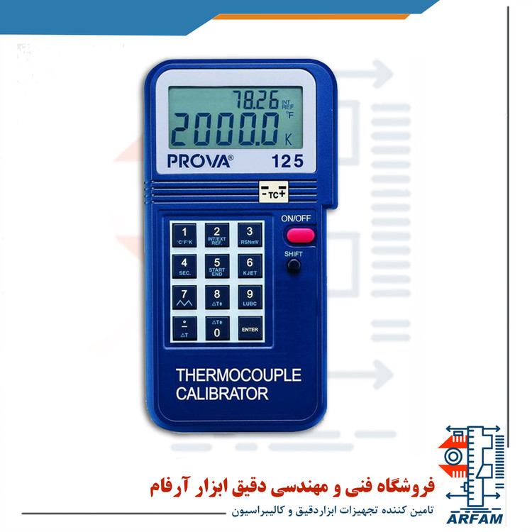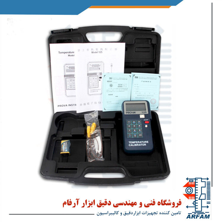 کالیبراتور دما مدل Prova 125 جهت کالیبراسیون دستگاه های اندازه گیری دما از جمله ترمومتر های تابلویی و پرتابل که توسط ترموکوپل کار میکنند, استفاده می شود. این کالیبراتور دما قابلیت کالیبره 11 نوع ترموکوپل (C,B,U,L,N,S,R,T,E,J,K) و ولتاژ -10~60mV را دارد. بطور مثال در ترموکوپل نوع K برای مرجع داخلی قابلیت کالیبره در محدوده -200~1370 ̊C با خطا ±0.4 ̊C است. از ویژگی های مهم کالیبراتور ترموکوپل Prova-125 مرجع دما داخلی و خارجی، دقت نمایش 0.1 ̊C، ورودی اختلاف دما، اختلاف دمای کاهشی و افزایشی، را می توان نام برد.