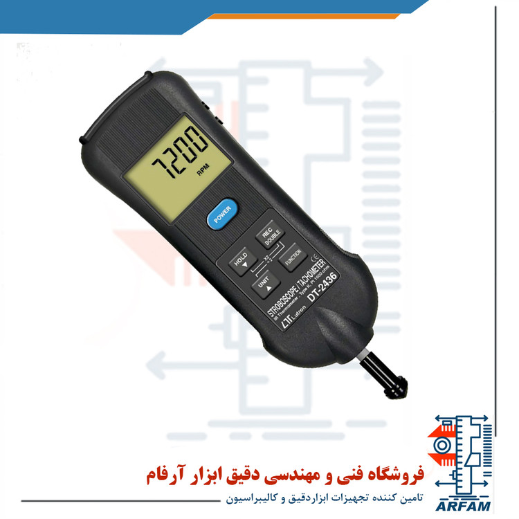 فانکشن استروبوسکوپ: 100 تا 99990 RPM با رزولوشن 0.1، 1، 5 و 10 RPM و دقت 0.1%+2d