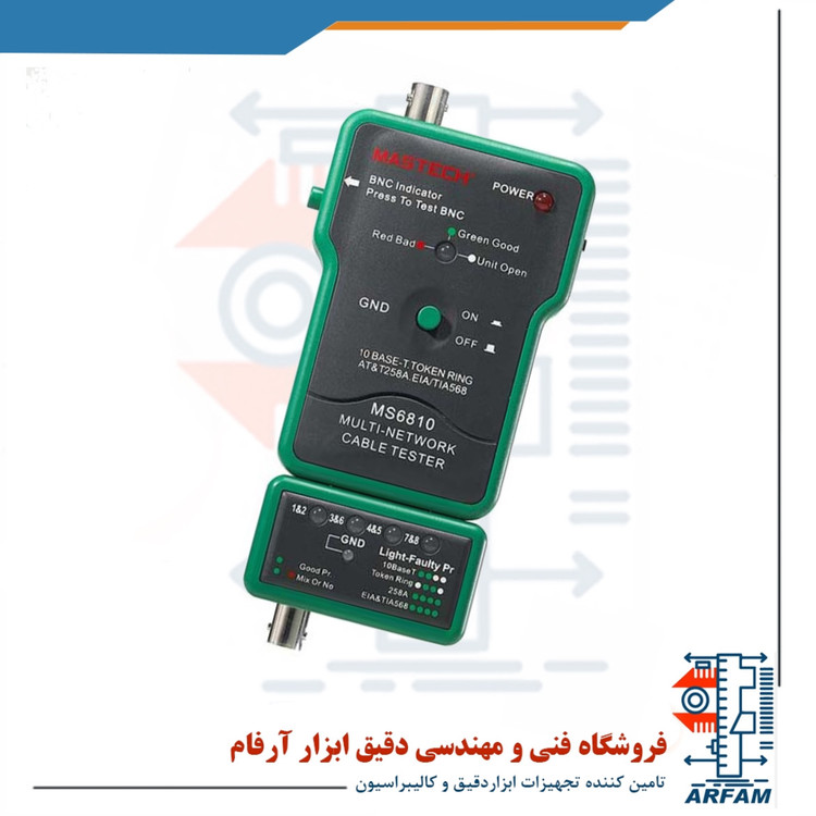 تستر کابل شبکه برای کابل BNC برند مستک مدل MASTECH MS6810 یک تستر دقیق، ایمن و قابل اعتماد است که دارای یک چراغ LED با 2 رنگ سبز و قرمز می باشد که در صورت سلامت و ایمنی مدار چراغ مذکور سبز می شود، در صورت وجود عیب در مدار چراغ آن قرمز و در صورت باز بودن مدار چراغ خاموش می ماند. این دستگاه همچنین دارای 4 چراغ LED دیگر می باشد که به کمک دستور العمل مکتوب روی بده دستگاه کاربر را در تشخیص و بررسی عیب مدار یاری می رساند. تستر کابل شبکه MS6810 همچنین دارای یک دکمه جداگانه به منظور روشن کردن تست BNC می باشد که از مزایای پر طرفدار در میان کاربران محصوب می شود. منبع تغذیه این دستگاه یک باتری 9 ولت 6F22 می باشد که دارای طول عمر طولانی می باشد.