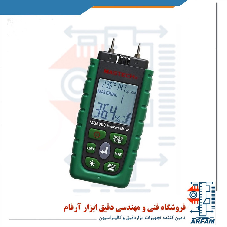 رطوبت سنج چوب نفوذی دیجیتال برند مستک مدل MASTECH MS6900 یک وسیله اندازه گیری ایمن و قابل اطمینان برای اندازه گیری رطوبت و دمای داخلی چوب و مصالح ساختمانی می باشد که دارای دو سنسور شبیه دوشاخ است که در داخل اجسام مورد نظر فرو رفته و رطوبت و دمای مربوطه را اندازه گیری می نماید. این دستگاه قادر به اندازه گیری رطوبت مواد را از 0.0 تا 60.0 درصد، رطوبت نسبی از 10 تا 90 درصد، دمای محیط از 10- تا 50 درجه سانتی گراد و یا از 14 تا 122 درجه فارنهایت می باشد که از دقت بسیار بالایی برخوردار است. عمق کاری رطوبت سنج MS6900 از 0 تا 50 میلی متر است و دارای رنج های اندازه گیری رطوبت به شرح زیر است: چوب های راش، صنوبر، لارچ، توس، گیلاس، گردو از 8.5 تا 60 درصد، بلوط، سرو، افرا، درخت خاکستر، درخت آبشار صورتی، گز از 6.8 تا 53.4 درصد، سیمان صاف و بتن از 0.9 تا 24.5 درصد، کفپوش آندریت از 0 تا 12.2 درصد، ملات سیمان از 0.7 تا 9.2 درصد، ملات آهک و گچ از 0.5 تا 11.1 درصد و آجر از 0 تا 17.8 درصد.رطوبت سنج چوب نفوذی دیجیتال برند مستک مدل MASTECH MS6900 ابزاری ایمن، سبک و قابل حمل است که مناسب برای اندازه گیری رطوبت و دمای داخلی انواع چوب مانند راش، صنوبر، گیلاس، سرو، گردو، افرا، درخت خاکستر، گز و مصالح مختلف مانند سیمان، بتن، گچ و غیره می باشد. از مزایای قابل توجه این دستگاه می توان به خاموش شدن خودکار، اندازه گیری مقدار ماکزیمم / مینیمم، نمایش کاهش باتری، نور پس زمینه، سرعت نمونه برداری 240 میلی ثانیه، انتخاب حالت های WB, TD, °C, °F و RH% و ثابت نگهداشتن داده ها اشاره کرد.