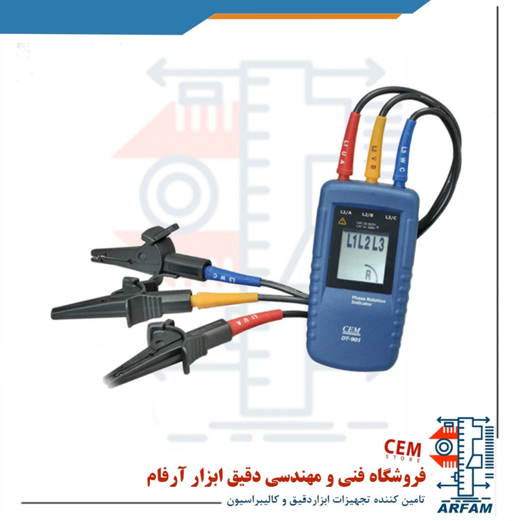 کاربرد دستگاه CEM DT-901 برای اندازه گیری چرخش فاز در مواردی که از منابع سه فاز برای تغذیه موتورها، درایوها و سیستمهای الکتریکی استفاده می کنند، مناسب است. DT-901 دستگاه شناسایی میدان دوار سیستمهای سه فاز دارای نمایشگر LCD با نور پس زمینه و تعیین جهت چرخش فاز برای تعیین درستی اتصالات است. این دستگاه مکانیزم تعیین سریع توالی فاز را فراهم می کند. پروب های تست عرضه شده به همراه دستگاه برای اتصالات ایمن خصوصاً در پریزهای صنعتی کاربرد دارد. هدف های بکارگیری دستگاه را میتوان تشخیص ترتیب سه فاز، تشخیص rst سه فاز ، تست توالی فاز سنج R S T tester و توالی یاب، تشخیص جهت گردش موتور نام برد