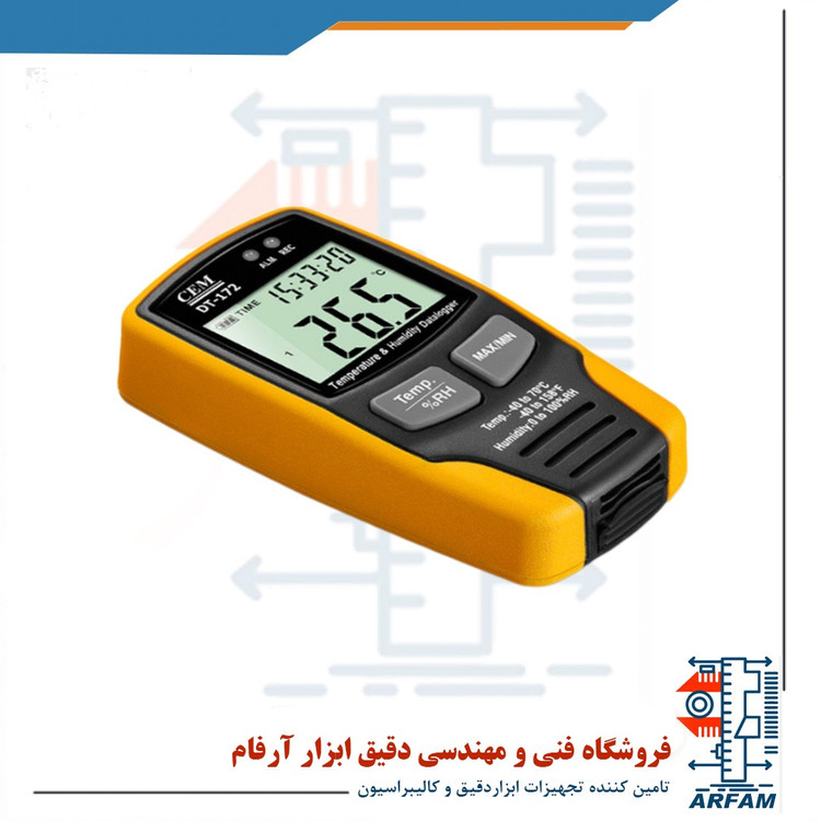 دیتالاگر دیجیتال دما و رطوبت مدل CEM DT172TK دستگاهی به منظور اندازه گیری و ثبت مقادیر حاصل از اندازه گیری بر روی حافظه لاگر دستگاه می باشد . محدوده اندازه گیری دما در بازه -۴۰ تا ۷۰ درجه سانتی گراد و محدوده اندازه گیری رطوبت نیز در محدوده ۰ تا ۱۰۰% RH می باشد. حافظه لاگر این مدل دارای ظرفیت ۳۲۰۰۰ مقدار برای ذخیره اطلاعات می باشد که بدین ترتیب می توان اطلاعات را تا دراز مدت در اختیار داشت و به منظور کاوش و بررسی به رایانه منتقل کرد.