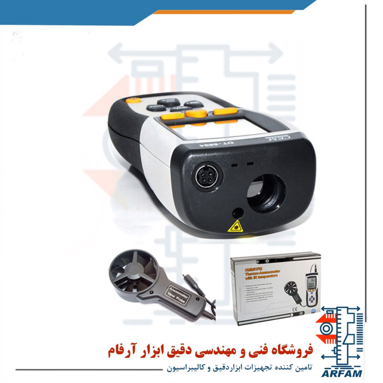 ترموآنمومتر ساخته شده با دماسنج مادون قرمز (لیزری/غیرتماسی) و پراب خارجی(پراب مجزا) برای اندازه گیری سرعت باد (کابل 1.2 متر)، همچنین سرعت سنج باد سنسور مجزا DT-8894 میتواند فلو هوا را در CMM و CFM اندازه گیری کند. توسط دماسنج IR داخلی اندازه گیری دمای سطح تا 500 درجه سانتیگراد را انجام میدهد.